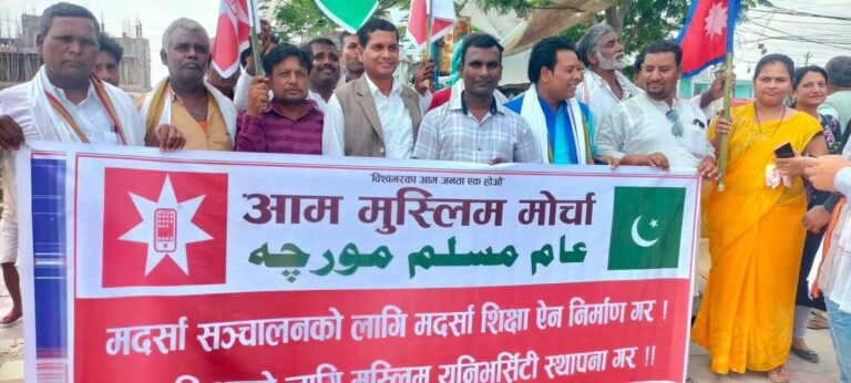 काठमाडौं, २१ असार । आम जनता पार्टीको संगठन आम मुस्लिम मोर्चाले मदर्सा शिक्षालाई व्यवस्थित् रुपमा सञ्चालन गर्न छुट्टै ऐन निर्माण र मदर्सा बोर्ड गठन गर्न माग गर्दै आज जनकपुरमा प्रदर्शन गरेको छ । मोर्चाले उच्च शिक्षा हासिल गर्न मुस्लिम विश्वविद्यालयपनि स्थापन गर्नुपर्ने माग गरेको छ ।
