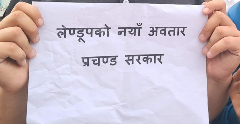 प्रदर्शनमा ‘लेण्डुपको नयाँ अवतार, प्रचण्ड सरकार’लगायतका नेमप्लेटहरूसहित विभिन्न नारा लगाउँदै प्रदर्शन गरेका हुन्।