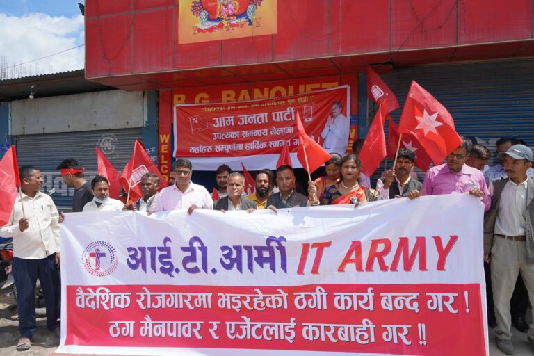 वैदेशिक रोजगारमा भइरहेको ठगी रोक्न तथा ठग मैनपावर र एजेंटलाई कारबाहीको माग गर्दै आईटी आर्मीले कोटेश्वर-बालकुमारी क्षेत्रमा प्रदर्शन गरेको हो।