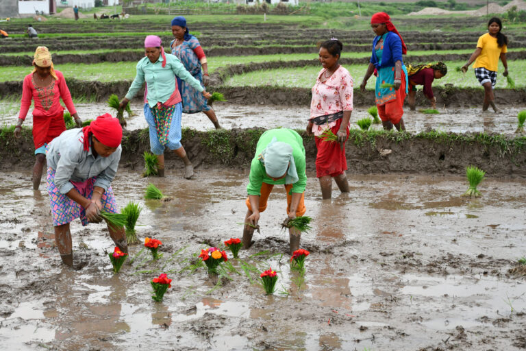 दाङ, २६ असार । घोराही उपमहानगरपालिका १८ मसिना गाउँका महिलाहरु सोमबार रोपाइँमा भकारी बाध्दै ।
