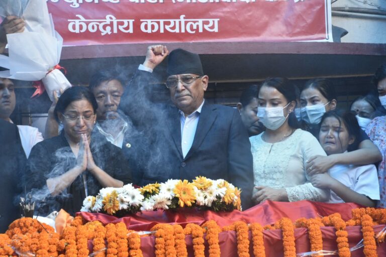काठमाडौं, २७ असार । प्रधानमन्त्री पुष्पकमल दाहाल ‘प्रचण्ड’ पत्नी सीता दाहालको निधन भएको छ । आज (बुधबार) विहान ८ः ३३ बजे थापाथलीस्थित नर्भिक अस्पतालमा उपचारको क्रममा उनको निधन भएको हो । स्वर्गीय सीता दाहालको पार्थिव शरीर अन्तिम श्रद्धाञ्जलीको लागि अहिले कार्यालय पेरिसडाँडामा राखिएको छ ।