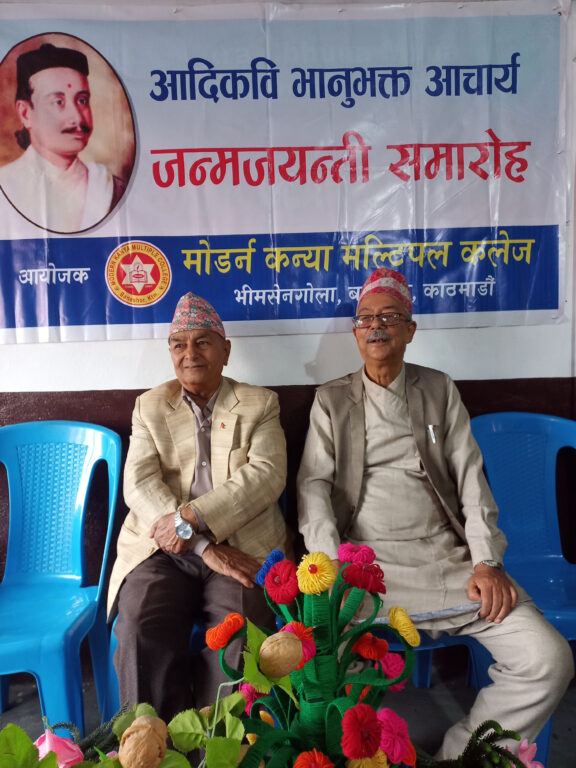 काठमाडौँ, २९ असार । नेपाली भाषा र साहित्यका आदिकवि भानुभक्त आचार्यको २१०औँ जन्मजयन्तीका अवसरमा उनले नेपाली भाषा र साहित्यको उन्नयनमा पु¥याउनुभएको योगदानका विविध पक्षको स्मरण गर्दै चर्चा गरिएको छ । मोर्डन कन्या मल्टिपल कलेज, भीमसेन गोला, बानेश्वरले आज आयोजना भानुजयन्ती कार्यक्रममा इतिहासविद्, साहित्यकार, प्राध्यापक र छात्राहरूले भानुले नेपाली साहित्यको श्रीवृद्धिमा पु¥याएको योगदानबारे कविता र मुक्तकमार्फत उजागर गर्दै उनलाई प्रेरणा दिने घाँसीको समेत स्मरण गरे ।