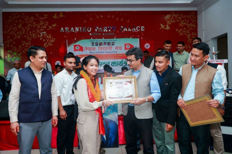 काठमाडौं, ३१ असार । नेपाल विद्यार्थी संघ काभ्रेले माध्यमिक शिक्षा परीक्षा (एसईई) मा उत्कृष्ट नतिजा ल्याउने विद्यार्थीलाई सम्मान गरेको छ । हिजो (शनिबार) बनेपामा एक कार्यक्रम गरेर नेवीसंघ काभ्रेले निजी विद्यालयबाट ३ दशमलव ९५ जीपीए ल्याउने १२ जना, सामुदायिक विद्यालयबाट ३ दशमलव ७५ जीपीए ल्याउने सामुदायिक विद्यालयका ९ जनासहित विद्यालयमा उत्कृष्ट नतिजा ल्याउने ९ सय ५० विद्यार्थीलाई सम्मान गरिएको हो ।