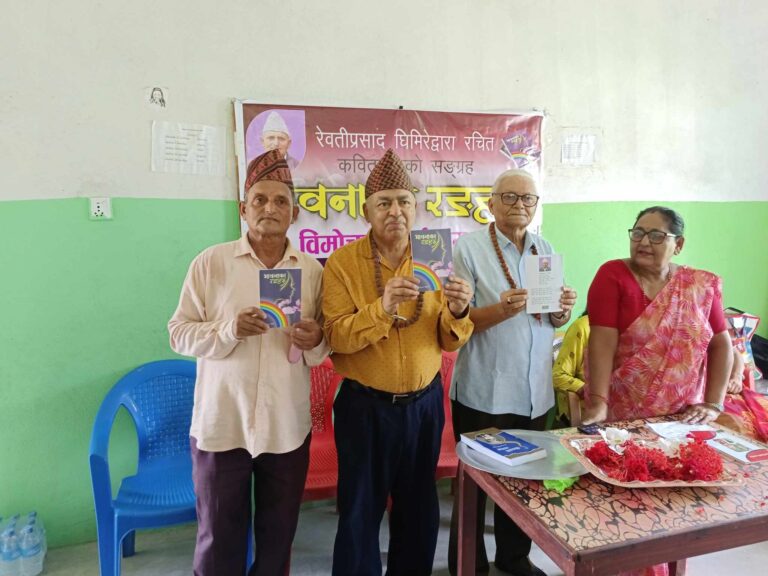 काठमाडौं, १ साउन । साहित्यकार रेवतीप्रसाद घिमिरेको ‘भावनाका रङ्गहरु’ कविता संग्रह विमोचन भएको छ । विमोचन साहित्यकार डा.गोविन्दराज भट्टराईको प्रमुख आथित्यतामा विद्या शीलप एकेडेमी दमकमा सम्पन्न भएको हो । घिमिरेको कविता कृति ‘भावनाका रङ्गहरु’ को प्रमुख अतिथि प्रा.डा. भट्टराई, साहित्यकार खेमलाल पोख्रेल ,प्राध्यापक अन्जना शर्मा ,लेखक रेवती घिमिरेले संयुक्त रुपमा विमोचन गरेका थिए ।