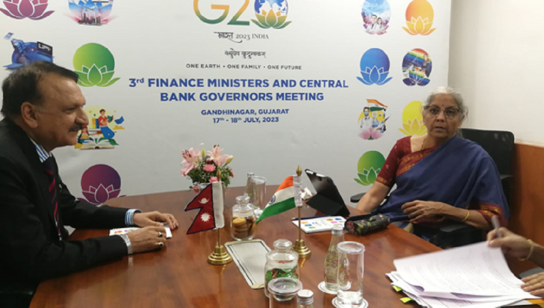 काठमाडौं, २ साउन । भारतको गुजरातमा भइरहेको जी–२० मुलुकका अर्थमन्त्रीहरूको बैठकका अवसरमा अर्थमन्त्री डा. प्रकाशशरण महत र भारतीय अर्थमन्त्री निर्मला सीतारमणबीच आपसी सहयोग र द्विपक्षीय सम्बन्धका बारेमा छलफल भएको छ ।
