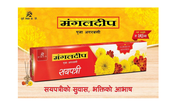 काठमाडौं, साउन ४ । सूर्य नेपाल प्रालिले नयाँ उत्पादन मंगलदीप सयपत्री पूजा अगरबत्ती नेपाली बजारमा सार्वजनिक गरेको छ। आकर्षक प्याकेजिङ भएको सयपत्री अगरबत्तीको हरेक प्याकमा ९ इन्चका ४० वटा काँटीहरु हुन्छन्।