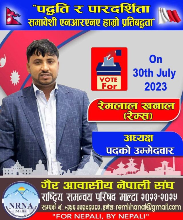 अध्यक्षमा उम्मेदवारी घोषणा गर्दै खनालले समग्र माल्टावासिको आग्रहलाई स्विकार गर्दै आफूले निर्वाचनमा होमिएको बताए । उनले आफू माल्टामा सर्वसम्मति नेतृत्वको पक्षमा रहेको र जती पहल गर्दा पनि हालको कार्यसमितीका केही पदाधिकारीले निर्वाचनको विकल्प नदिएपछि ढिलो गरि उम्मेदवारी घोषणा गरेको बताए ।