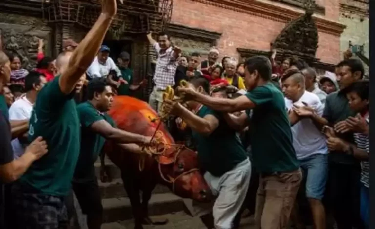 भादगाउँ, ८ साउन । आउँदो वडादशैँका लागि भक्तपुरको नवदुर्गा मन्दिरमा खःम्ये (निख्खर कालो राँगो) भित्र्याइएको छ । घन्टाकर्ण चतुर्दशीदेखि जनैपूर्णिमाभित्र नवदुर्गा मन्दिरको द्यःछें (देवगृह)मा खम्ये भित्र्याउनुपर्ने परम्पराअनुसार आज खम्ये भित्र्याइएको हो ।