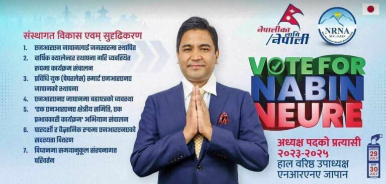 ‘गफ होइन काम, त्याग, समर्पण र साथ-सहयोगले मात्र समाजको सुखदुःखको सारथी बन्न सकिन्छ । यही विश्वासका साथ गैरआवासीय नेपाली संघ जापानका लागि २०२३-२५ कार्यकालको नेतृत्वका लागि मैले अध्यक्ष पदमा उम्मेदवारी दिएको हु ।’ अध्यक्ष पदका प्रत्यासी निउरेले भने— “म बोल्नु भन्दापनि काम गरेर देखाउने मान्छे हुँ भन्ने कुरा मेरा विगतका कार्यले पनि प्रष्ट पारेका छन । बिगतका दिनहरुमा जसरी यस पटक समाजको काम गर्न एनआरएनए जापानको अध्यक्ष पदमा निर्वाचित गराइदिनु भै नेपाली समुदायको अभिभावकीय भूमिका प्रदान गर्ने मेरो दृढ इच्छाशक्तिलाई हौसलासँगै मन र मतबाट सहयोग गर्नुहुनेछ भन्ने विश्वास लिएको छु ।