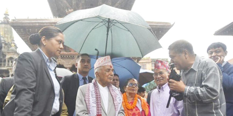 काठमाडौं, साउन १२ । राष्ट्रपति रामचन्द्र पौडेल पाटन दरबार क्षेत्र अवलोकनका लागि ललितपुरको पाटन क्षेत्र पुगेका छन् । लामो समयको आरामपछि सार्वजनिक रुपमा देखिएका राष्ट्रपति पौडेलाई ललितपुर महानगरपालिकाका मेयर चिरीबाबु महर्जनले स्वागत गरेका थिए ।