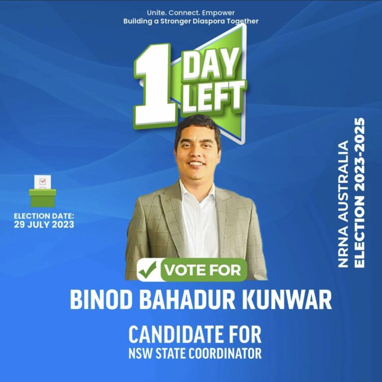 काठमाडौं, १२ साउन । एनआरएनए अष्ट्रेलिया २०२३–२०२५ को लागि एनएसडब्लू स्टेट को-अर्डिनेटर पदमा विनोद कुँवरले उम्मेदवारी दिएका छन् । भोलि (शनीबार) हुन लागेको उक्त निर्वाचनमा कुँवरको उम्मेदवारीलाई विशेष चासोका साथ हेरिएको छ ।