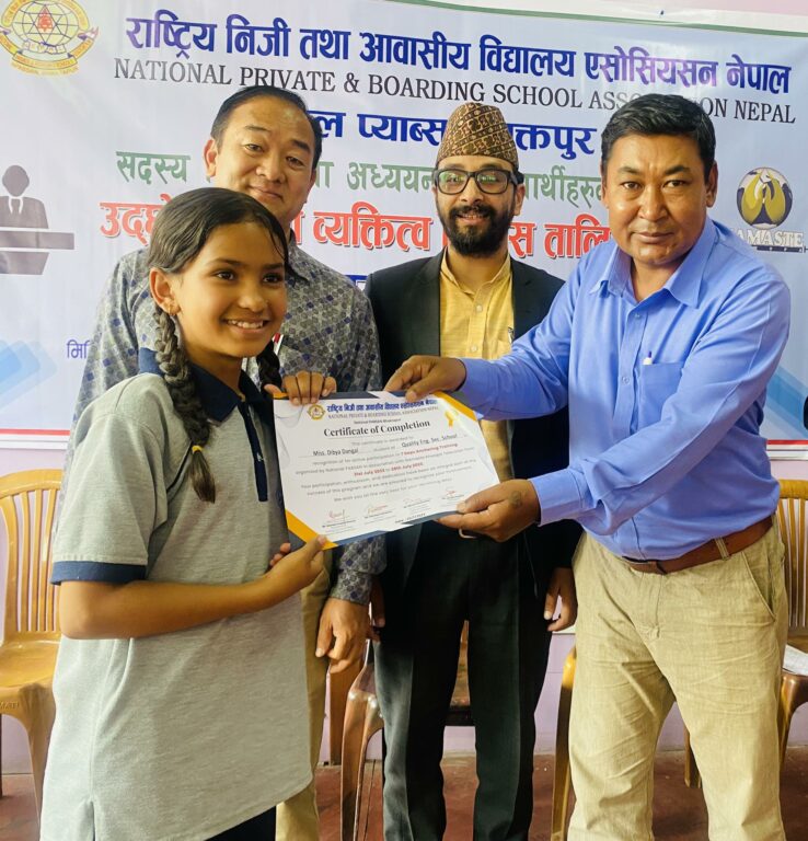 प्रमुख अतिथि ढुकुछुले प्रमाण पत्र वितरण पछि बोल्दै भने, “नेसनल प्याव्सन भक्तपुरले विद्यार्थीहरुको लागि उदघोषण र बोल्ने कलाको तालिम प्रदान गरी विद्यार्थी जीवन देखि नै व्यक्तित्व विकासमा टेवा दिन सकेकामा ह्रृदय देखि धन्यावद छ ।”