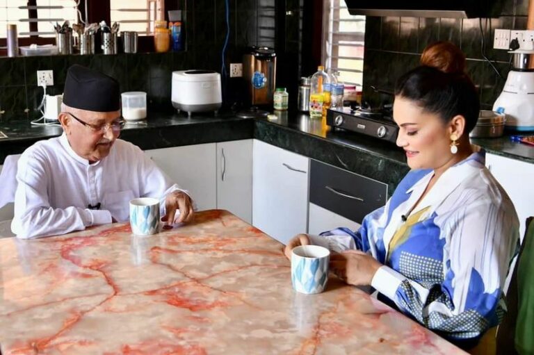 ओलीले सामाजिक सञ्जालमा तस्बिर सेयर गर्दै लेखेका छन्,‘कलाकार रीमा विश्वकर्मासँग आफ्नै घर बालकोटमा चिया पिउँदै गरेको यो तस्बिरसँगै सबैलाई नमस्कार, शुभ बिहानी! तपाईंहरू पनि चियाको आनन्द लिनुस् है! Good Friday !!!’