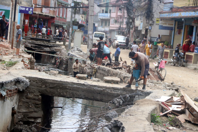 काठमाडौँ, १९ साउन । काठमाडौँको सामाखुसी खोलामाथि निर्माण गरिएको ‘स्ल्याब’ हटाउन सुरुआत गरेको छ । काठमाडौँ महानगरपालिका नगर प्रहरीको टोलीले बसुन्धराबाट चौकी, रानीबारी, रेडन, म्हैपी हुँदै विष्णुमती भएर बहने सामाखुसी खोलामाथि निर्माण गरिएको ‘स्ल्याब’ हटाउन थालेको हो ।