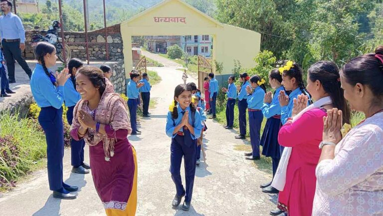 तनहुँ, , साउन २२ । तनहुँको व्यास नगरपालिका–१० दुम्सीस्थित शिव माध्यमिक विद्यालयका शिक्षकले प्रवेशद्वारमा बसेर विद्यार्थीलाई नमस्कार गर्दै स्वागत गर्न सुरुआत गरेका छन्।