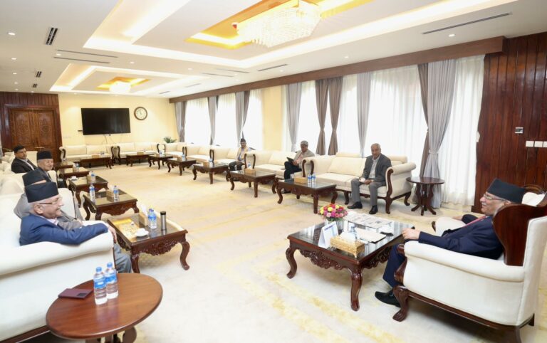 प्रधानमन्त्रीको सरकारी निवास बालुवाटरमा पुष्पकमल दाहाल ‘प्रचण्ड’, सभामुख देवराज घिमिरे, नेपाली कांग्रेसका सभापति शेरबहादुर देउवा, नेकपा (एमाले) का अध्यक्ष केपी शर्मा ओली लागयत तीनै दलका संसदीय दलका प्रमुख सचेतकहरु छलफलमा सहभागी रहेका छन्।