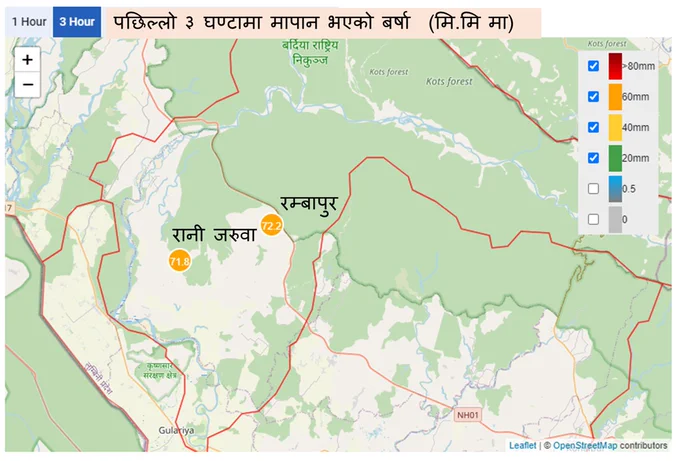 महासाखाले जारी गरेको सूचनामा भनिएको छ– पछिल्लो ३ घण्टामा बर्दियाको रम्भापुर, रानी वर्षामापन केन्द्र र आसपासका क्षेत्रमा भारी वर्षा मापन भएको र थप वर्षा हुने पूर्वानुमान छ। सो क्षेत्र भई बहने ससाना खोलामा आकस्मिक बाढी आउनसक्ने, तटीय क्षेत्रमा रहनुहुनेले दिउँसोसम्मै सतर्कता अपनाऔँ।