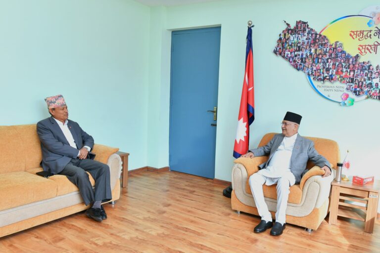 काठमाडौं,३० साउन । नेकपा एमोलका अध्यक्ष केपी शर्मा ओली र पूर्व उपाध्यक्ष भीम रावलबीच भेटवार्ता भएको छ । ओली र रावलबीच आज एमाले मुख्यालय च्यासलमा भेटवार्ता भएको हो ।