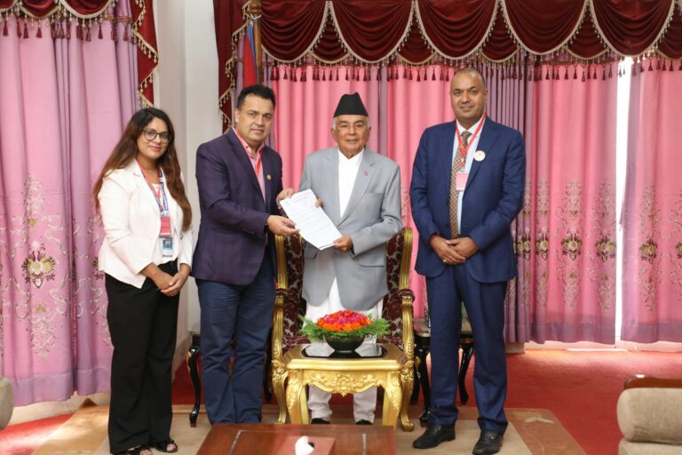 काठमाडौं, ३२ साउन । गैरआवासीय नेपाली संघ (एनआरएनए) का कार्यकारी अध्यक्ष डा बद्री केसी र अध्यक्ष कुल आचार्यले राष्ट्रपति रामचन्द्र पौडेलसँग भेट गरेका छन् । शितलनिवासस्थित राष्ट्रपति निवासमा आज (बिहीबार) भएको भेटमा राष्ट्रपति पौडेललाई संघको आगामी अक्टोबरमा हुने ११औँ महाधिवेशन तथा विश्व सम्मेलनको उद्घाटन सत्रका लागि निमन्त्रणा दिईएको एनआरएनए सचिवालयले जनाएको छ ।