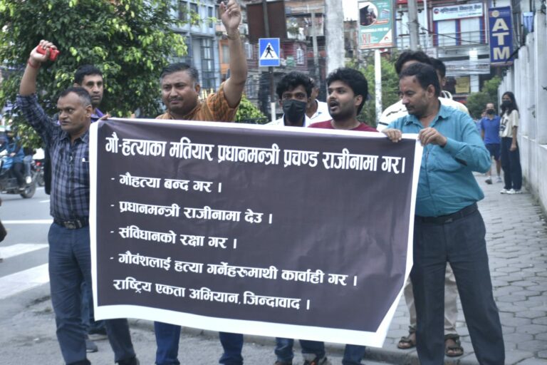 उनीहरुले लगाएको नारामा ‘गौ हत्या बन्द गर’, प्रधानमन्त्री राजीनामा देउ, संविधानको रक्षा गर, गौवंशलाई हत्या गर्नेहरुमाथि कारबाही गरलगायत थिए । तस्विर: मुकुन्द कालिकोटे, रिपोर्टर्स नेपाल डटकम