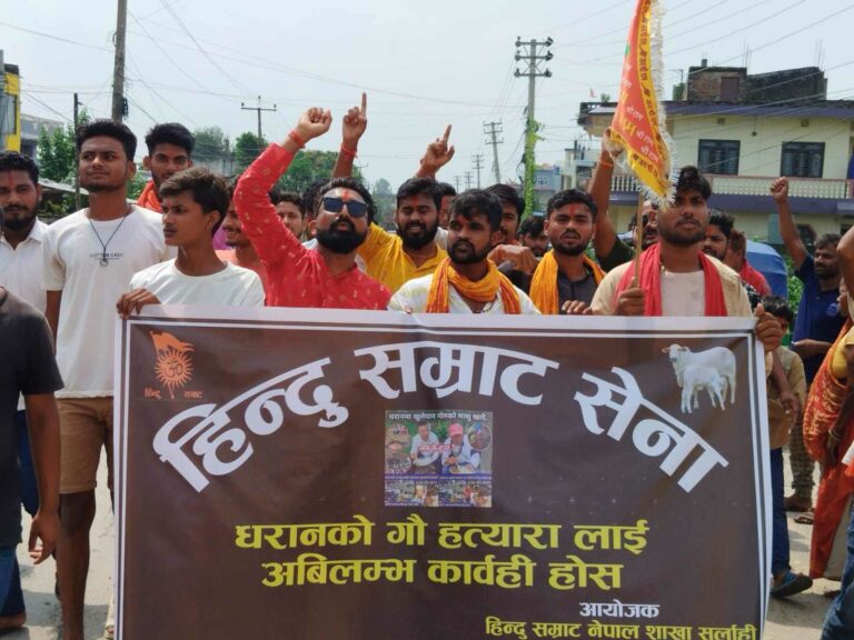 काठमाडौं, १० भदौ । हिन्दू सम्राट सेना, सर्लाही शाखाले धरानमा भएको गौ हत्याको विरोधमा आज सर्लाहीमा प्रदर्शन गरेको छ । कृष्ण यादवको नेतृत्वमा भएको विरोध प्रदर्शनमा गौ हत्यामा संलग्न दोषीहरुलाई अविलम्ब कारबाहीको माग गरिएको थियो ।