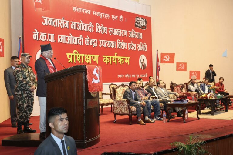 काठमाडौं, भदौ १२। प्रधानमन्त्री एवं नेपाल कम्युनिस्ट पार्टी (माओवादी केन्द्र) का अध्यक्ष पुष्पकमल दाहाल ‘प्रचण्ड’ ले माओवादी पार्टीलाई रूपान्तरण गरेर मात्रै देश रूपान्तरणको आधार तयार पार्न सकिने बताएका छन् ।