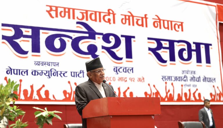 काठमाडौं, भदौ १३ । चार दल सम्मिलित समाजवादी मोर्चाले आज सुदूरपश्चिमको धनगढीमा सन्देशसभा आयोजना गर्दै छ । सुदूरपश्चिम प्रदेशस्तरीय सन्देश सभालाई प्रधानमन्त्री एवं नेकपा माओवादी केन्द्रका अध्यक्ष पुष्पकमल दाहाल ‘प्रचण्ड’लगायतका शीर्ष नेताहरूले सम्बोधन गर्ने कार्यक्रम रहेको छ । यसअघि बुधबार बुटवलस्थित अन्तर्राष्ट्रिय सम्मेलन केन्द्रमा सभाको आयोजना गरिएको थियो ।