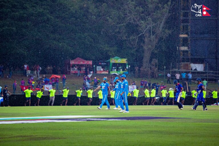 काठमाडौं,१८ भदौ । वर्षाका कारण प्रभावित भएको नेपाल र भारतबीचको खेल पुनः सुरु भएको छ। एसिया कप अन्तर्गत नेपाल र भारतको खेल जारी रहँदा पानी परेपछि केहीबेर खेल रोकिएको थियो।
