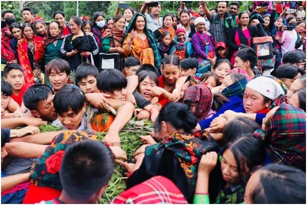 यो दृश्य निकै नै अनौठो र रोमाञ्चक देखिन्छ । कोही घोडा र सिकारीको भेषमा नाचिरहेका हुन्छन्, कोही सारङ्गी बजाउँदै हिँड्छन् । ढ्याङ्ग्राको ताल झन्झन् जोडले बज्न थाल्छ । युवायुवतीबीच खोसाखोस र ठेलमठेल चलिरहेकै हुन्छ । अन्तिममा एक पक्षले जित्छ । जसले जिते पनि सुँगुरको साँप्रोको मासु प्रसादका रूपमा सबै मिलेर ग्रहण गर्छन् ।
