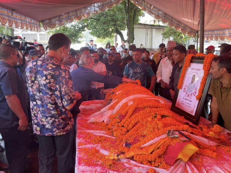 काठमाडौं, २१ भदौ । नेपाल समाजवादी पार्टीका अध्यक्ष तथा पूर्व प्रधानमन्त्री डा. बाबुराम भट्टराईले कामनपा वडा नम्बर १६ का अध्यक्ष मुकुन्द रिजालको निधनबाट लोकतान्त्रिक आन्दोलनलाई ठूलो क्षति पुगेको बताएका छन् । भट्टराई स्वर्गी रिजालको पार्थिव शरीरमा अन्तिम श्रद्धाञ्जली दिन राष्ट्रियसभा गृहमा पुगेका थिए ।