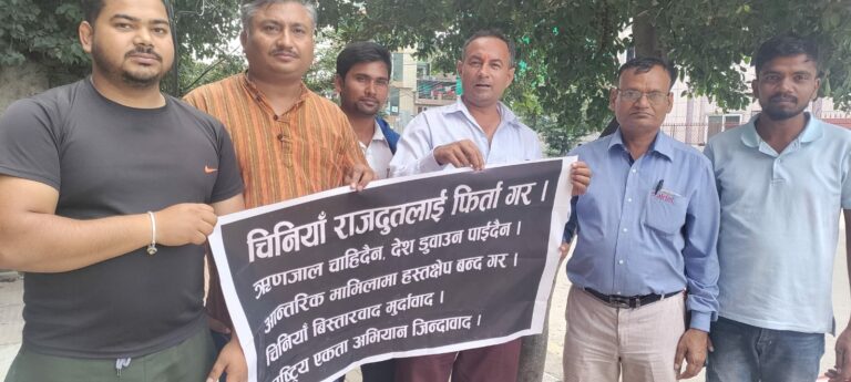 काठमाडौं, २१ भदौ । राष्ट्रिय एकता अभियानले काठमाडौंस्थित चीनियाँ दूतावास अगाडि प्रदर्शन गरेको छ। राजदूतले नेपालको आन्तरिक मामिलामा हस्तक्षेप गरेको विरोधमा अभियानले प्रदर्शन गरेको हो।