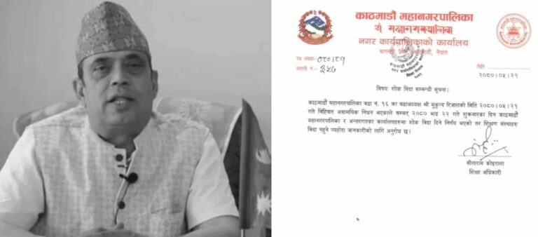 काठमाडौं–१६ का वडाध्यक्ष मुकुद रिजालको निधनमा महानगरले आज शोक बिदा दिएको हो । उनको उपचारको क्रममा बिहिवार निधन भएको थियो ।