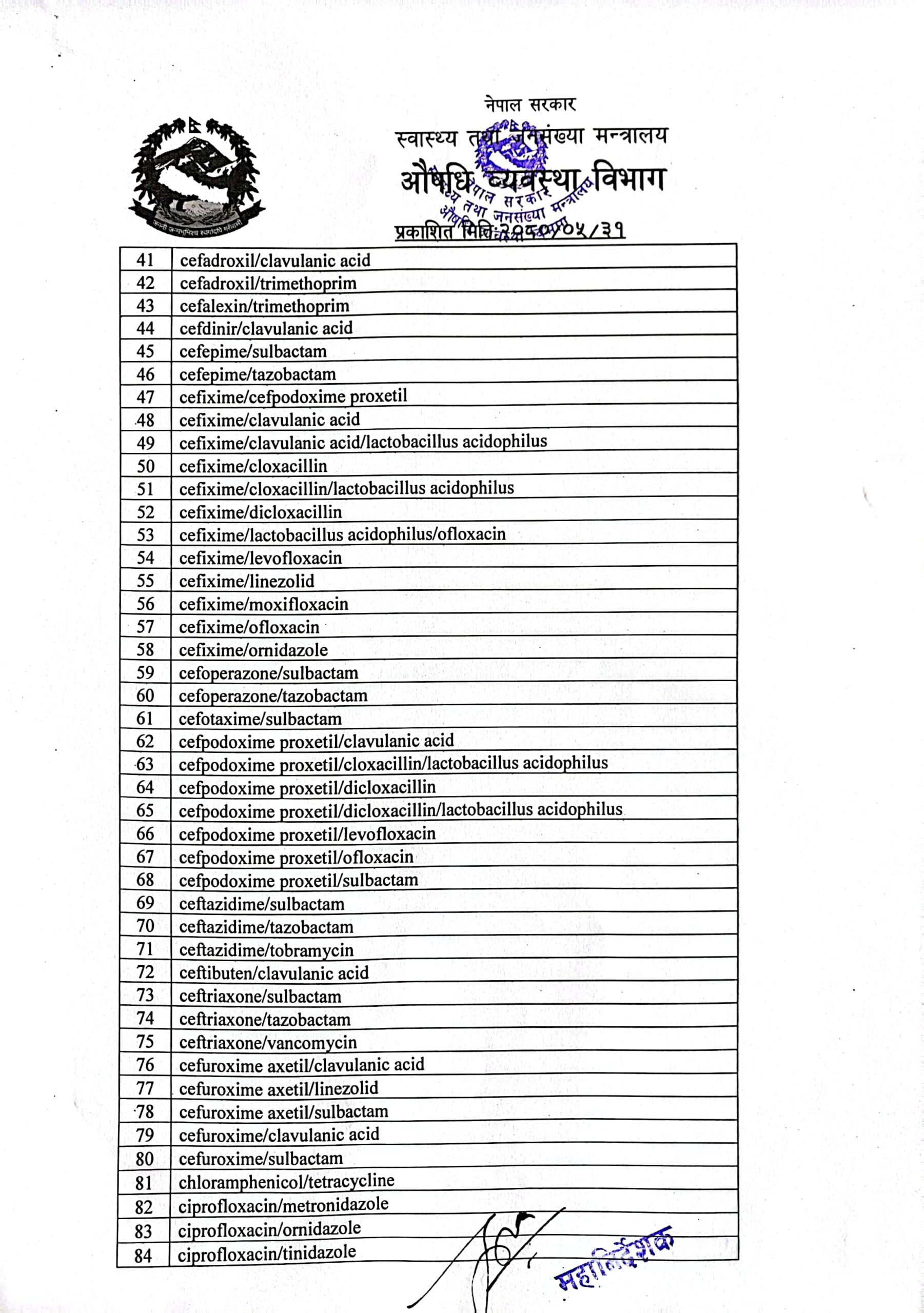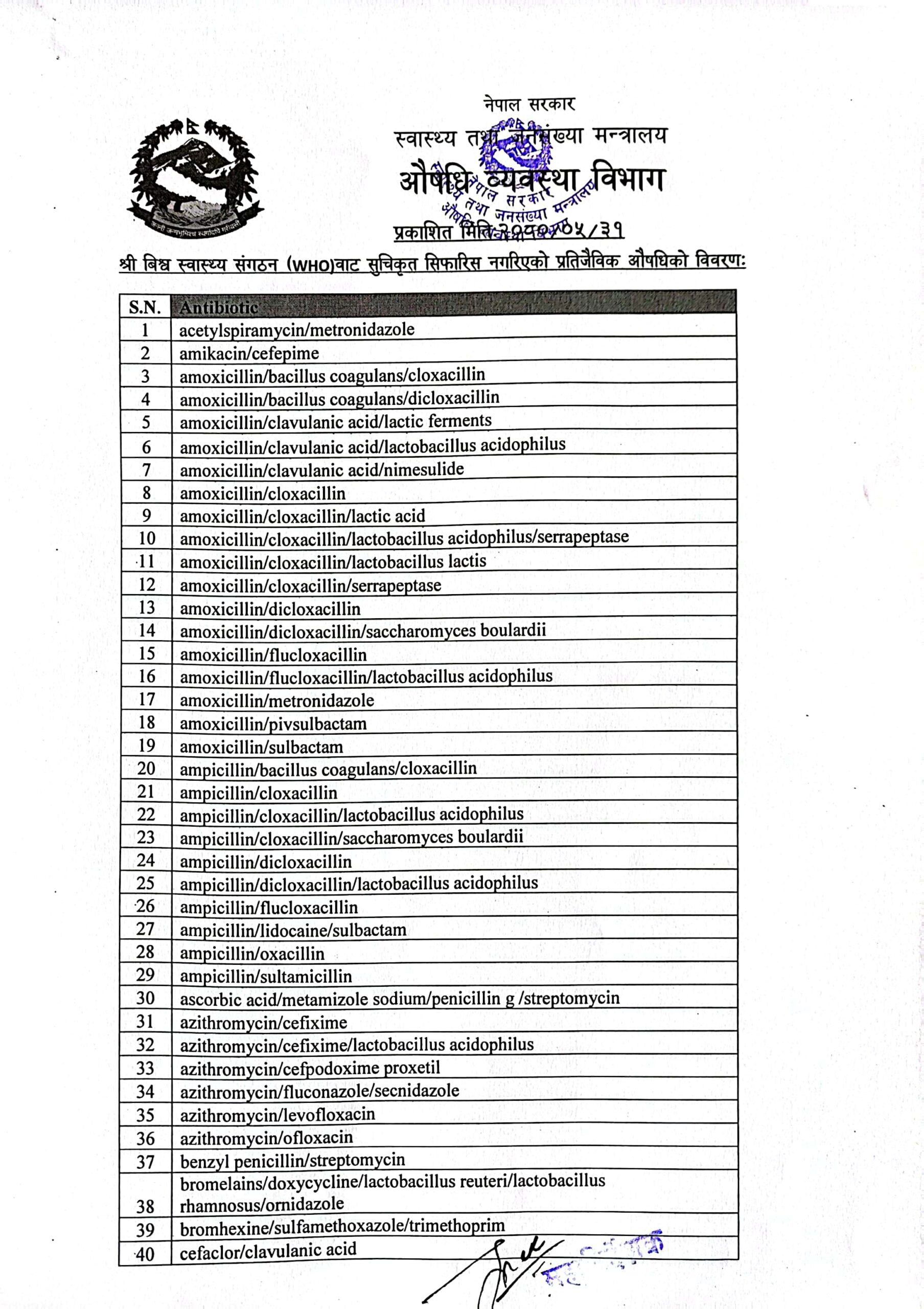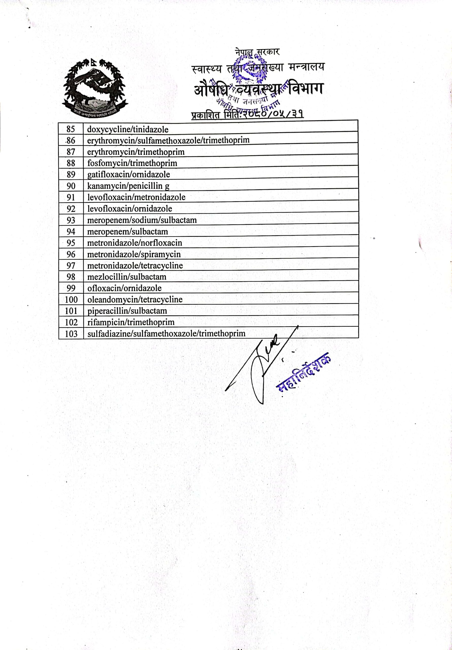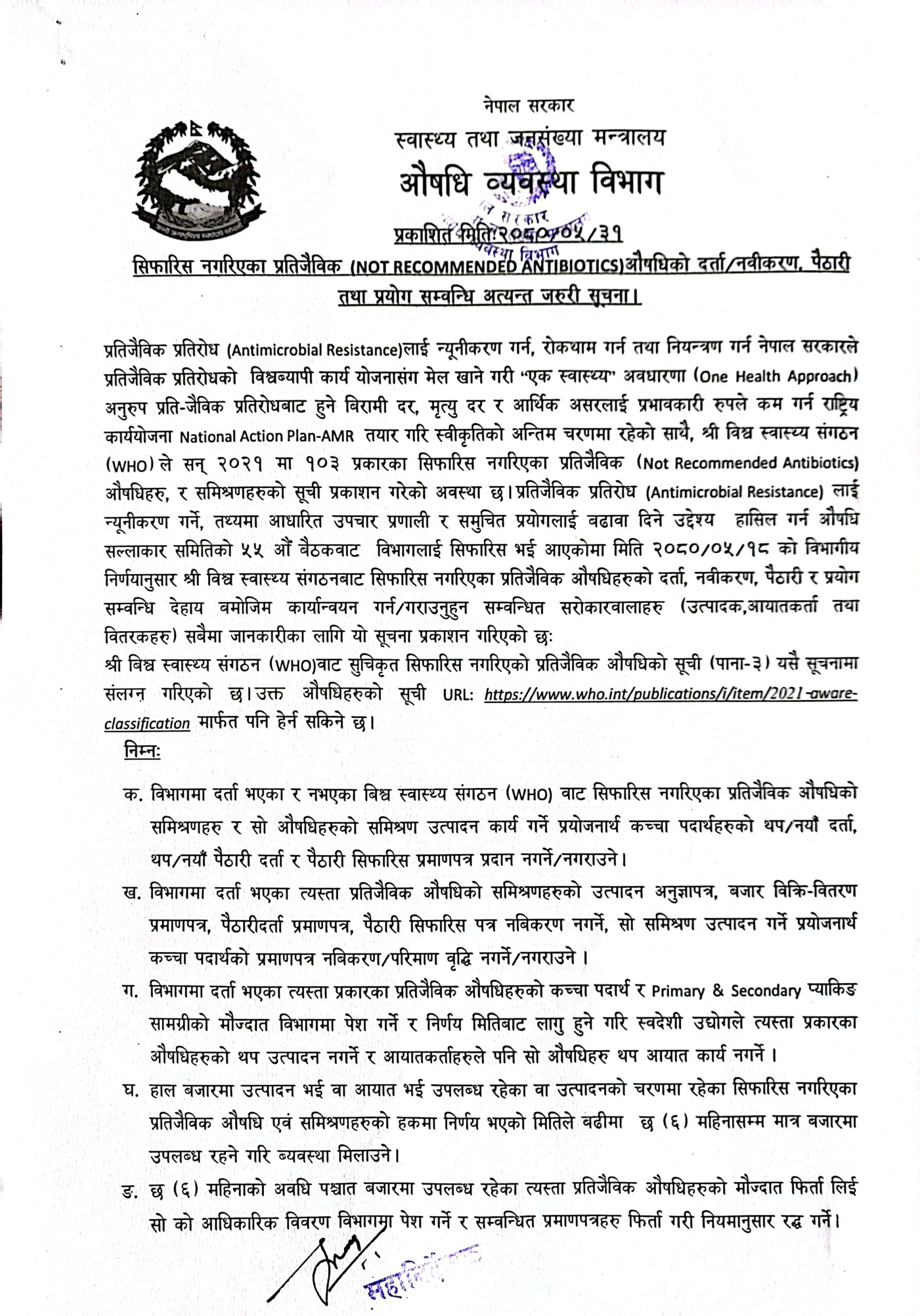 विभागमा दर्ता भएका र नभएका तथा डब्लुएचओबाट सिफारिस नगरिएका प्रतिजैविक औषधीको समिश्रणहरु र सो औषधीको समिश्रण उत्पादन कार्य गर्ने प्रयोजनार्थ कच्चा पदार्थको थप नयाँ/दर्ता, थप/नयाँ पैठारी दर्ता र पैठारी सिफारिस प्रमाणपत्र नगर्ने, विभागमा दर्ता भएका त्यस्ता प्रतिजैविक औषधीको समिश्रणको उत्पादन अनुज्ञापत्र, बजार विक्री वितरण प्रमाणपत्र, पैठारीदर्ता प्रमाणपत्र, पैठारी सिफारिस पत्र नवीकरण नगर्ने निर्णय गरिएको छ ।