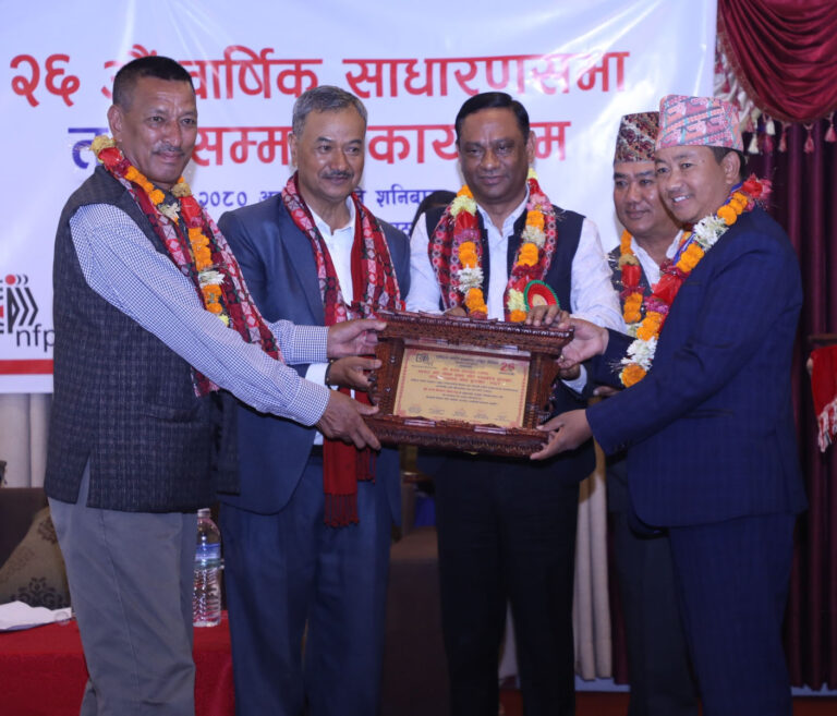 काठमाडौं, ६ असोज । वन तथा वातावरणमन्त्री डा वीरेन्द्र प्रसाद महतो नेपाल फोटो पत्रकार समूहको २६औँ वार्षिक साधारणसभामा हरिगोपाल प्रधानद्वारा स्थापित संस्कृति सम्पदा पत्रकारिता पुरस्कार राष्ट्रिय समाचार समिति९रासस०का फोटो पत्रकार रत्नकृष्ण श्रेष्ठलाई प्रदान गर्दै । तस्बिर : चन्द्रकला क्षेत्री/रासस
