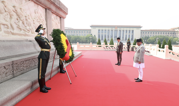 बेइजिङ, ८ असोज । प्रधानमन्त्री पुष्पकमल दाहाल ‘प्रचण्ड’ले आज चीनको राजधानी बेइजिङस्थित तियानमेन स्क्वायरमा रहेको चिनियाँ कम्युनिष्ट पार्टीका नेता स्वर्गीय माओ त्सेतुङको समाधीस्थलमा पुष्पाहार अर्पण गरी श्रद्धाञ्जलि व्यक्त गरेका छन्
