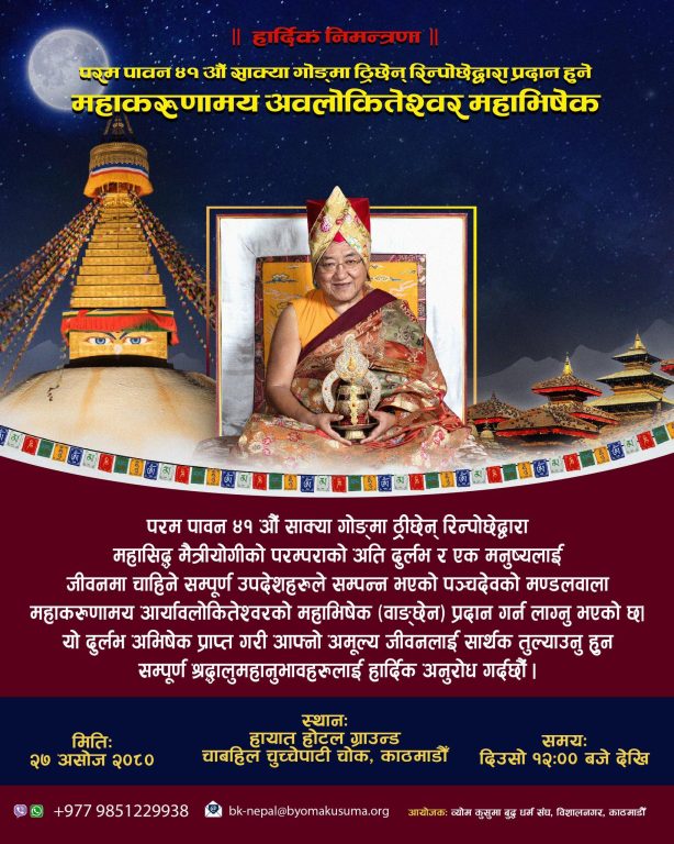 काठमाडौँ, ९ असोज । आउँदो असोज २७ गते शनिबार महान् गुरु ४१ औँ साक्या गोङ्मा ठ्रिछेन् रिन्पोछेद्वारा दुर्लभ महाभिषेक (वाङ्छेन्) कार्यक्रम हुने भएको छ । गुरु रिन्पोछेको नेपाल भ्रमणको सिलसिलामा प्रदान गर्न लागिएको ऐतिहासिक महाभिषेक कार्यक्रम काठमाडौँको चुच्चेपाटी, बौद्धस्थित तारागाउँ म्युजियमको खुलाचौरमा हुनेछ ।