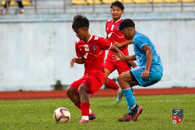 काठमाडौँ, १० असोज : साफ यू–१९ च्याम्पियनसिप फुटबल प्रतियोगितामा नेपाल भारतसँग पराजित भएको छ । त्रिपुरेश्वरस्थित दशरथ रङ्गशालामा आज भएको दोस्रो सेमिफाइनल खेलमा भारतसँग नेपाल टाइब्रेकरमा ३–२ गोलअन्तरले पराजित भएको हो । टाइब्रेकरमा नेपालका प्रशान्त लक्सम लिम्बू, लक्ष्मण थापा र विक्रम तामाङले गोल गर्न चुकेपछि नेपाल पराजित भएको हो । नेपालका लागि अश्विन घोरासिनी र कुशल देउवाले गोल गरेका थिए ।