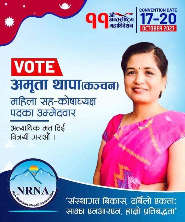 काठमाडौं, असोज ११ । गैरआवासीय नेपाली संघ (एनआरएनए) वर्तमान सह-कोषाध्यक्ष अमृता थापा (कंचन) ले आगामी महाधिवेशनमा पनि पुनः सोही पदमा रहेर काम गर्न चाहेकी छन् । वर्तमान एनआरएनए चीनको संस्थापक एंव पूर्व अध्यक्ष रहेकी थापाले हङकङ र चीनमा रहेको नेपाली समुदायलाई निरन्तर साथ र सहयोग दिदै पुनः सोही पदमा रहेर काम गर्न चाहेकी आएकी हुन्। त्यस क्षेत्रका नेपालीहरुले सम्मान स्वरुप भाउजु भनेर सम्बोधन गर्ने थापा एनआरएनएका तत्कालीन अध्यक्ष स्व. सुन्दर थापाको जीवन संगिनी हुन् ।