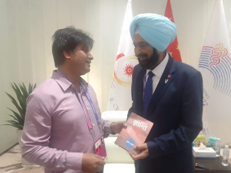 हाङझाउ (चीन), १२ असोज । एसियाली ओलम्पिक काउन्सिलका कार्यवाहक अध्यक्ष राज रणधीर सिंहले नेपाली खेलकुदको पहिलो ऐतिहासिक पुस्तक ‘नेपाली खेलकुदको वृत्तन्त’ विश्व खेलकुदका लागि महत्वपूर्ण दस्तावेज हुने बताए । यहाँस्थित ओलम्पिक स्पोर्टस् सेन्टरमा बिहीबार ‘नेपाली खेलकुदको वृत्तन्त’ पुस्तकका लेखक एवम खेल पत्रुकार नविन अर्यालसितको भेटघाटमा उनले एसियाली खेलकुदको नालीबेली समेटिएको सो पुस्तक विश्व खेलकुदका लागि ‘माइलस्टन’ हुने बताए ।