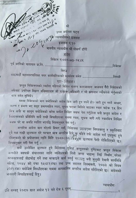 अदालतले काठमाडौं महानगरलाई आदेशमा भनेको छ, ‘छलफल हुने मितिसम्म सुविधा सन्तुलनको दृष्टिले प्रस्तुत निवेदक कम्पनीले बसपार्क सञ्चालनका लागि व्यक्तिको निजी जग्गा भाडामा लिई निर्माण गरेका संरचनालाई तोडफोड गर्ने तथा भत्काउने कार्य नगर्नु नगराउनु भनी मुलुकी देवानी कार्यविधि संहिता २०७४ को दफा १५८ (२) (ख) तथा उच्च अदालत नियमावली २०७३ को नियम ४२ (१) (क) बमोजिम विपक्षीहरुका नाममा अल्पपकालिन अन्तरिम आदेश गरिएको छ।’