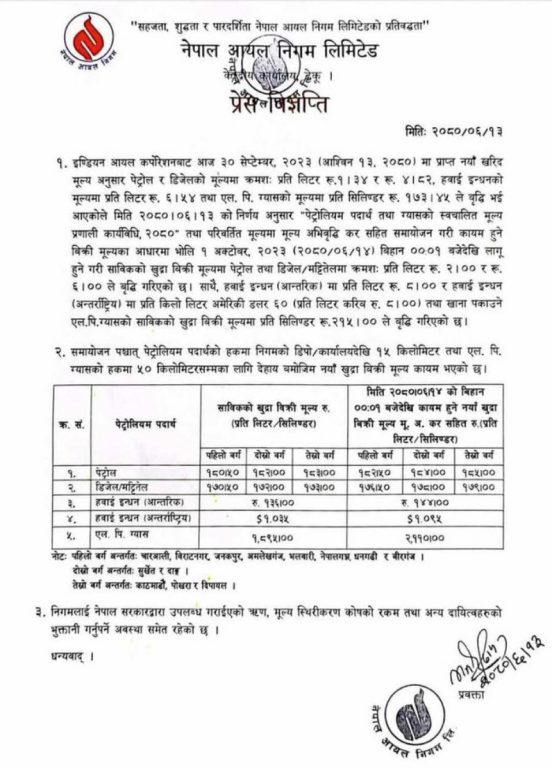 काठमाडौं, असोज १४ । सरकारले पेट्रोलियम पदार्थको मूल्य बढाएको छ । नेपाल आयल निगम सञ्चालक समितिको बैठकले शनिबार राति १२ बजेबाट लागू हुनेगरी मूल्य बढाएको हो । भारतबाट मूल्य बढेर आएको भन्दै निगमले मूल्य बढाएको छ ।