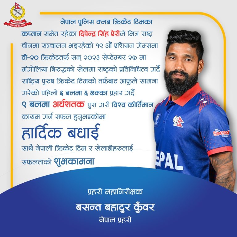 काठमाडौं,१४ असोज । चीनमा जारी १९औं एसियाली खेलकुदअन्तर्गत गत बुधबार भएको मंगोलियाविरुद्धको खेलमा बिष्फोटक ब्याटिङ गर्दै टी-२० अन्तर्राष्ट्रिय क्रिकेटमा विश्व कीर्तिमान कायम गरेका नेपाली राष्ट्रिय क्रिकेट टिमका अलराउन्डर दीपेन्द्रसिंह ऐरीलाई नेपाल प्रहरीका महानिरीक्षक बसन्तबहादुर कुँवरले बधाई लिएका छन् ।