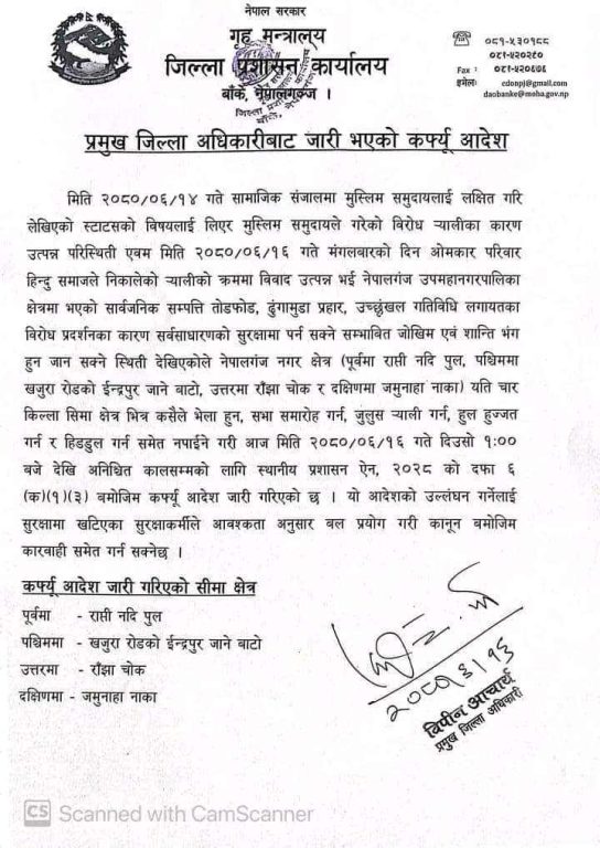 काठमाडौं,१६ असोज । बाँकेको नेपालगञ्जमा हिन्दु र मुस्लिम समुदायबिच तनाव बढेपछि मंगलबारदेखि अनिश्चितकालका लागि कर्फ्यू आदेश जारी भएको छ । जिल्ला प्रशासन कार्यालय बाँकेले आज दिउसो १:०० बजे देखि लागू हुने गरी अनिश्चित कालसम्मको लागि स्थानीय प्रशासन ऐन, २०२८ को दफा ६ (क) (१) (३) बमोजिम कर्फ्यू आदेश जारी गरेको हो ।
