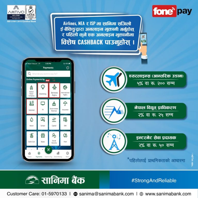 काठमाडौं, १७ असोजथ । सानिमा बैंक र फोनपे प्रा.लिको सहकार्यमा, सानिमा सजिलो इबैंकिङ्ग सेवा प्रयोगकर्ताका लागि विशेष क्यासब्याक योजना ल्याएको छ । उक्त योजना आगामी कार्तिक मसान्तसम्म लागू हुने बैंकले जनाएको छ ।