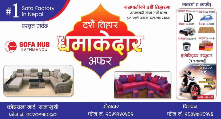 काठमाडौं, २० असोज । काठमाडौं र चितवनमा सञ्चालित सोफा हबले दशैँ अफर सार्वजनिक गरेको छ । ‘सोफा लिने भनेको सोफा हबको मात्र हो’ भन्ने मूल नाराका साथ अगाडि बढेको सोफा हबले हिन्दू नेपालीरुको महान पर्व विजयादशमी, शुभदिपावली तथा छठ पर्वको अवसर पारेर सोफा किन्ने ग्राहकलाई लक्षित गरी अफर सार्वजनिक गरेको हो ।
