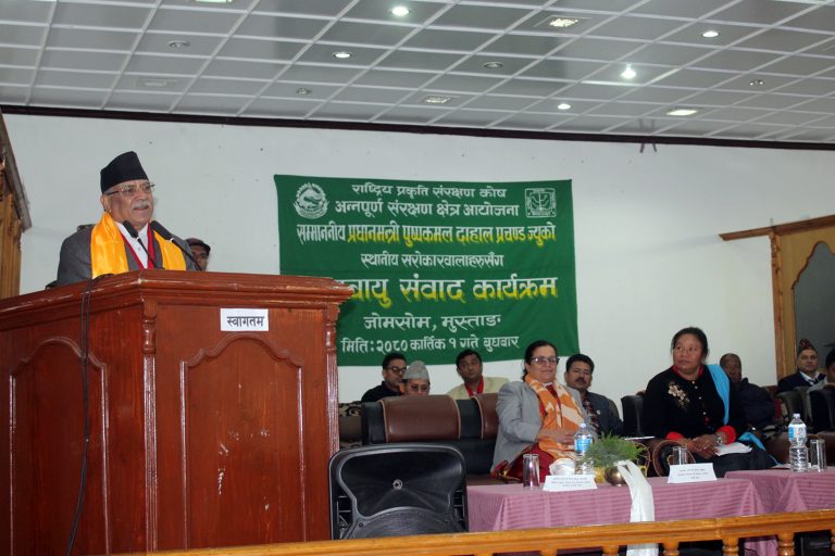 गण्डकी, १ कात्तिक । प्रधानमन्त्री पुष्पकमल दाहाल ‘प्रचण्ड’ले जलवायु परिवर्तन अन्तर्राष्ट्रिय चुनौती बनेको बताएका छन् । राष्ट्रिय प्रकृति संरक्षण कोषअन्तर्गत अन्नपूर्ण संरक्षण क्षेत्र आयोजनाद्वारा बुधबार मुस्ताङको जोमसोममा आयोजित जलवायु संवाद कार्यक्रममा उनले दक्षिण एसियाको हिमालय पर्वत शृङ्खला वरिपरि देखा परिरहेको जलवायु परिर्वतको असर विशिष्ट र गम्भीर खालको रहेको उल्लेख गरे ।