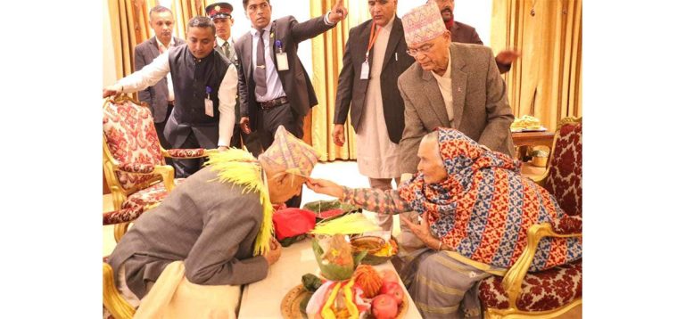काठमाडौँ, ७ कात्तिक : राष्ट्रपति रामचन्द्र पौडेलले ९१ वर्षीया भाउजू विष्णुमाया पौडेलबाट दसैँको टीका, जमरा, प्रसाद र आशिर्वाद ग्रहण गर्नुभएको छ । साथै गुरु पुरोहितबाट पनि दसैँको दीका, जमरा, प्रसाद ग्रहण गर्नुभयो ।