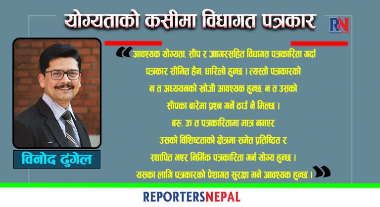 आवश्यक योग्यता, सीप र जाँगरसहित विधागत पत्रकारिता गर्दा पत्रकार सीमित हैन, धारिलो हुन्छ । त्यस्तो पत्रकारको न त अध्ययनको खोजी आवश्यक हुन्छ, न त उसको सीपका बारेमा प्रश्न गर्ने ठाउँ नै मिल्छ । बरू, ऊ त पत्रकारितामा मात्र नभएर उसको विशिष्टताको क्षेत्रमा समेत प्रतिष्ठित र स्थापित भएर निर्भिक पत्रकारिता गर्न योग्य हुन्छ । यसका लागि पत्रकारको पेशागत सुरक्षा भने आवश्यक हुन्छ । पत्रकारिताको संस्थागत विकासको वातावरण त त्यसको पूर्वशर्त नै हो । त्यसतर्फ अभिमुख हुने उद्देश्यका साथ अग्रसरतापूर्वक सार्थक वहस गर्नु जरुरी छ । अन्यथा पत्रकारको योग्यताको मन्द बहसको बाटोसम्म आइपुगेको नेपाली पत्रकारिता अन्य अपत्रकारीय मन्द विषको प्रभावमा जकडिन पुग्नेछ । त्यसो हुनु श्रम र पूँजीका लगानीकर्ताका लागि मात्र हैन, समग्र समाजकै अग्रगतिका लागि प्रतिकूल हुने पक्का छ ।
