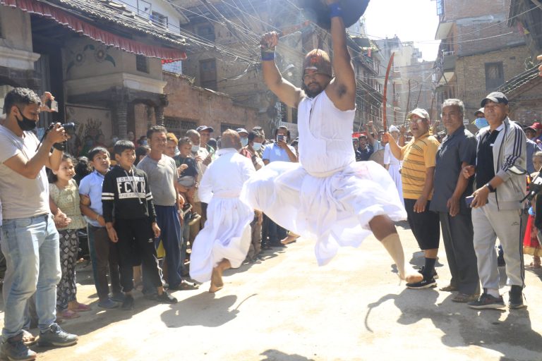 भादगाउँ (भक्तपुर), ९ कात्तिक : बडादसैँको एघारौँ दिन पापाङ्कुशा एकादशीको अवसरमा बुधबार मध्यपुर थिमिमा मल्लकालीन युद्धको झल्को दिने गरी (खाँ निस्कने) जात्रा सम्पन्न गरेको छ । तत्कालीन राजदरबारको रुपमा रहेको लाय्कुस्थित तलेजु भवानीको द्यो छेंबाट खड्ग, तरबार, ढाल, युद्धकवजलगायत मल्लकालीन युद्धमा प्रयोग हुने साधन बोकेर युद्धकला प्रदर्शन गर्दै खाँ पिहाँवईगु जात्रा सम्पन्न गरेको हो ।