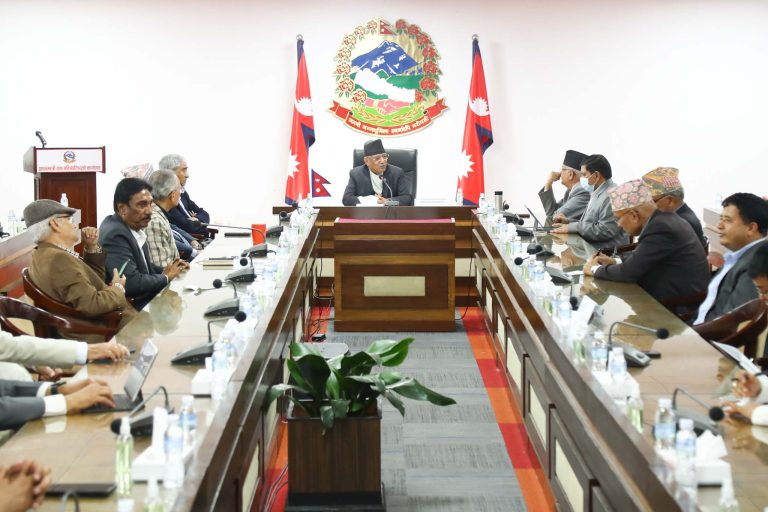 बैठक प्रधानमन्त्री तथा मन्त्रिपरिषद्को कार्यालय सिंहदरबारमा केहीबेर अघि सुरु भएको हो । बैठकमा राष्ट्रिय मान्यता प्राप्त राजनीतिक दलका शीर्ष नेता सहभागी छन् ।